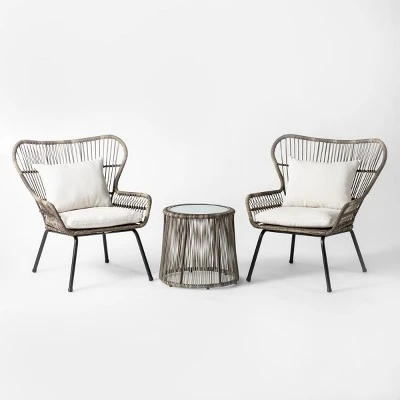 Enjoy a quiet conversation, coffee or book with the Latigo 3-Piece Rattan Patio Chat Set from Opalhouse™. Two cushioned wicker chairs support you on sturdily woven frames that are as easy to style around as they are comfortable. The round wicker coffee table with glass top moves around easily, so you can set it up in your preferred place to rest a drink or book. Tall wingback armchairs encourage you to sink back and relax with your closest friend or relative.