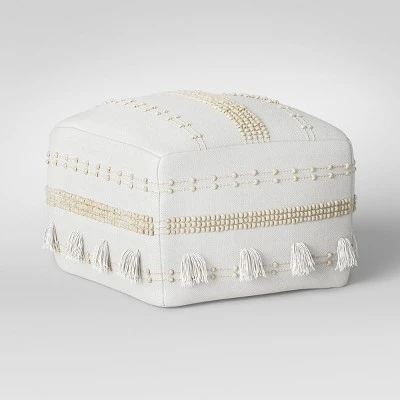 Create comfortable and inspired spaces in your home by using this Lory Pouf from Opalhouse™ to make your own eclectic style. This square ottoman pouf combines a unique variety of textures – from tufts to tassels to beads – to create a lively look. Made with a cotton and wool blend for softness and durability, this textured pouf ottoman is perfect for placing in front of a couch or armchair.